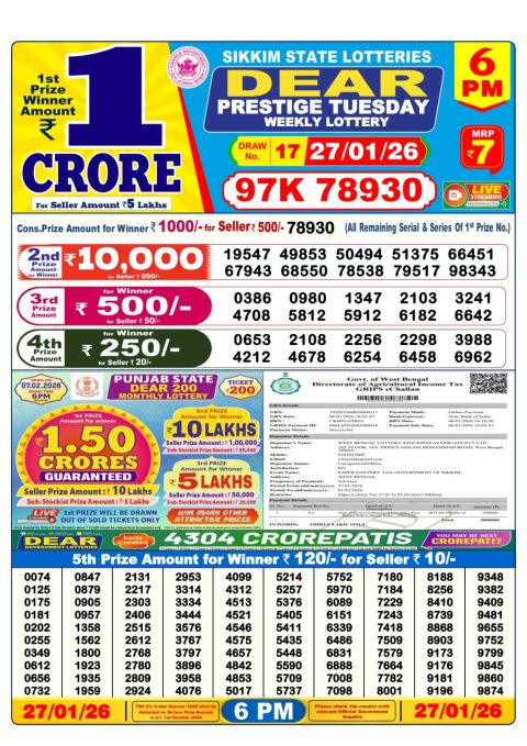 Dear Lottery 6pm Results 27.01.26