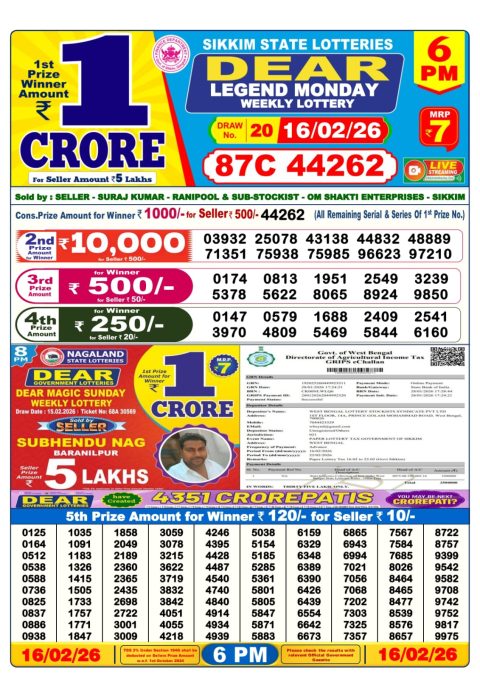 Dear Lottery 6pm Results 16.02.26
