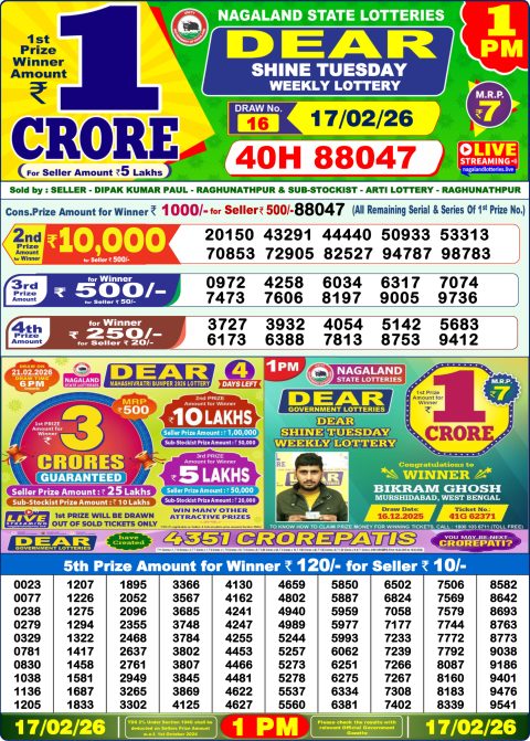 Dear Lottery 1pm Result 17.02.26
