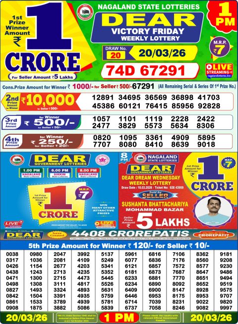 Dear Lottery 1pm Result 20.03.26