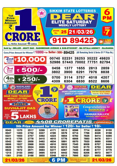 Dear Lottery 6pm Results 21.03.26