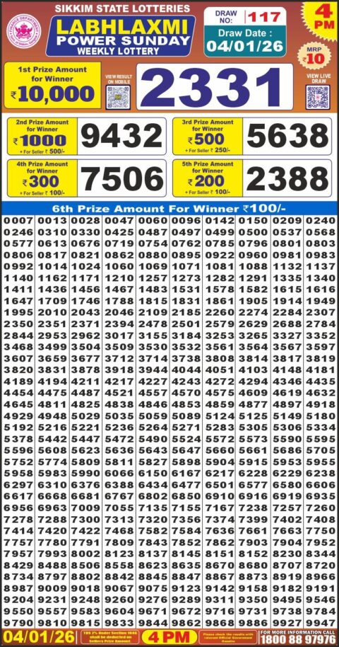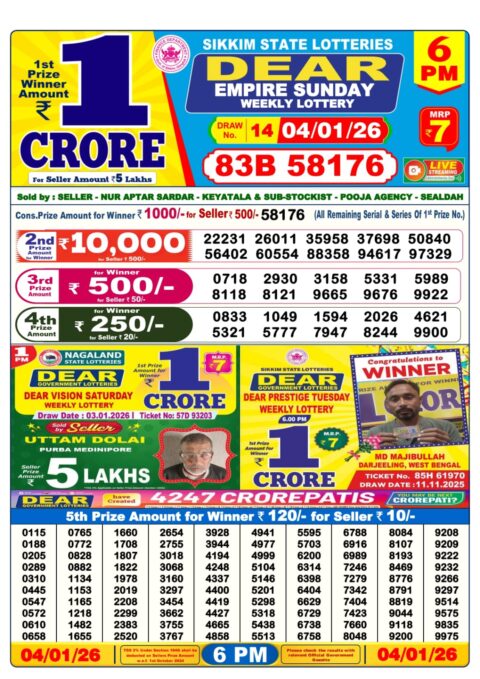 2026-01-05 Dear Lottery 8pm Result 05.01.26  2026-01-05 Dear Lottery 6pm Results 05.01.26  2026-01-05 Punjab State Dear 50 Lottery 6pm Result 05.01.26  2026-01-05 Labh Laxmi Lottery 4pm Result 05.01.26  2026-01-05 Dear Lottery 1pm Result 05.01.26  2026-01-04 Dear Lottery 8pm Result 04.01.26  2026-01-04 Dear Lottery 6pm Results 04.01.26  2026-01-04 Punjab State Dear 50 Lottery 6pm Result 04.01.26  2026-01-04 Labh Laxmi Lottery 4pm Result 04.01.26