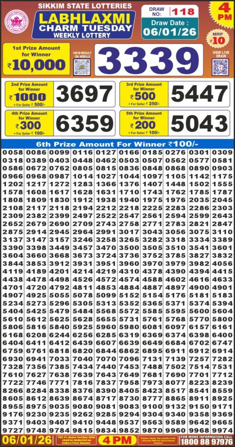 2026-01-07 Dear Lottery 8pm Result 07.01.26  2026-01-07 Dear Lottery 6pm Results 07.01.26  2026-01-07 Punjab State Dear 50 Lottery 6pm Result 07.01.26  2026-01-07 Labh Laxmi Lottery 4pm Result 07.01.26  2026-01-07 Dear Lottery 1pm Result 07.01.26  2026-01-06 Dear Lottery 8pm Result 06.01.26  2026-01-06 Dear Lottery 6pm Results 06.01.26  2026-01-06 Punjab State Dear 50 Lottery 6pm Result 06.01.26  2026-01-06 Labh Laxmi Lottery 4pm Result 06.01.26