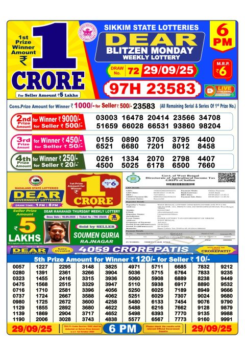 2025-10-23 Dear Lottery 8pm Result 23.10.25  2025-10-23 Dear Lottery 6pm Results 23.10.25  2025-10-23 Punjab State Dear 50 Lottery 6pm Result 23.10.25  2025-10-23 Labh Laxmi Lottery 4pm Result 23.10.25  2025-10-23 Dear Lottery 1pm Result 23.10.25  2025-10-22 Dear Lottery 8pm Result 22.10.25  2025-10-22 Dear Lottery 6pm Results 22.10.25  2025-10-22 Punjab State Dear 50 Lottery 6pm Result 22.10.25  2025-10-22 Labh Laxmi Lottery 4pm Result 22.10.25