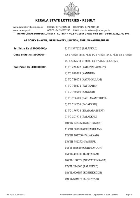 Kerala Bumper BR-105 Lottery Result 04.10.25 Live