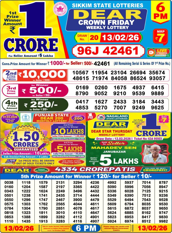 Dear Lottery 6pm Results 13.02.26 Leave a Comment on Dear Lottery 6pm Results 13.02.26 Spread the love