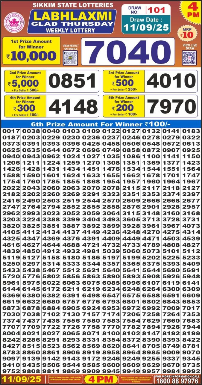 Labh Laxmi Lottery 4pm Result 11.09.25 Leave a Comment on Labh Laxmi Lottery 4pm Result 11.09.25 Spread the love