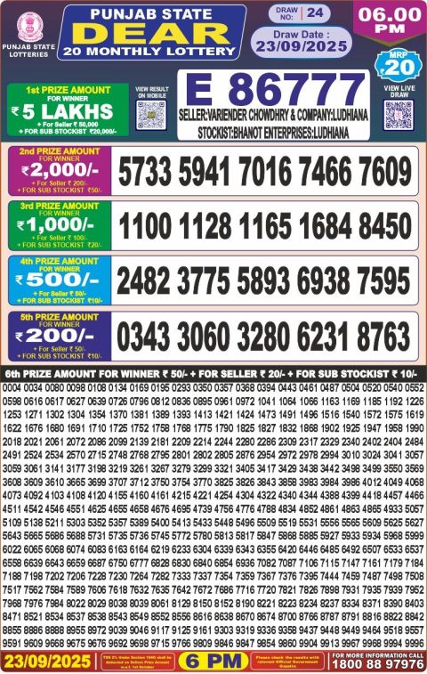 Punjab State Dear 20 Monthly Lottery Result 23.09.25 Live