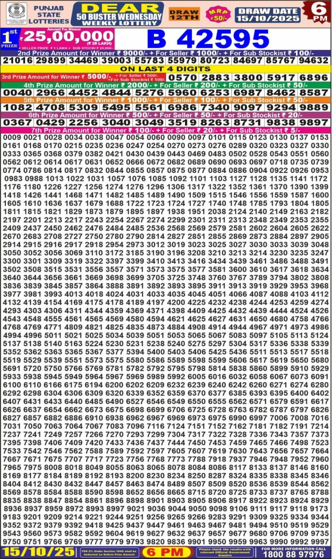 Punjab State Dear 50 Lottery 6pm Result 15.10.25 Leave a Comment on Punjab State Dear 50 Lottery 6pm Result 15.10.25 Spread the love