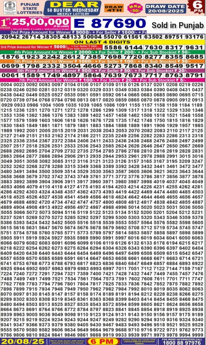 Punjab State Dear 50 Lottery 6pm Result 20.08.25