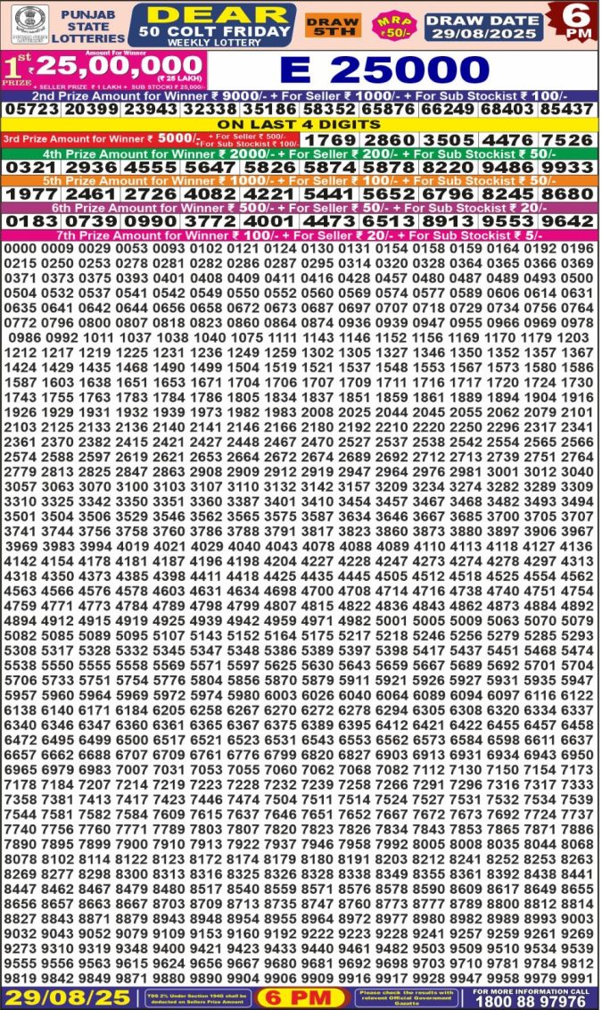 Punjab State Dear 50 Lottery 6pm Result 29.08.25 Leave a Comment on Punjab State Dear 50 Lottery 6pm Result 29.08.25 Spread the love
